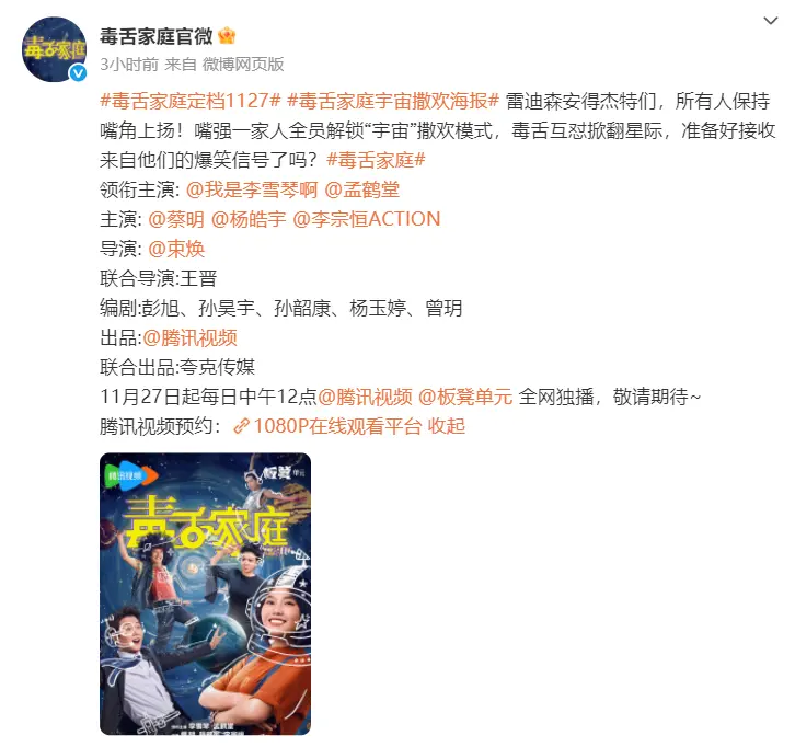 《毒舌家族》正式官宣定档,将于11月27日在腾讯视频的“板凳单元”独家上线。