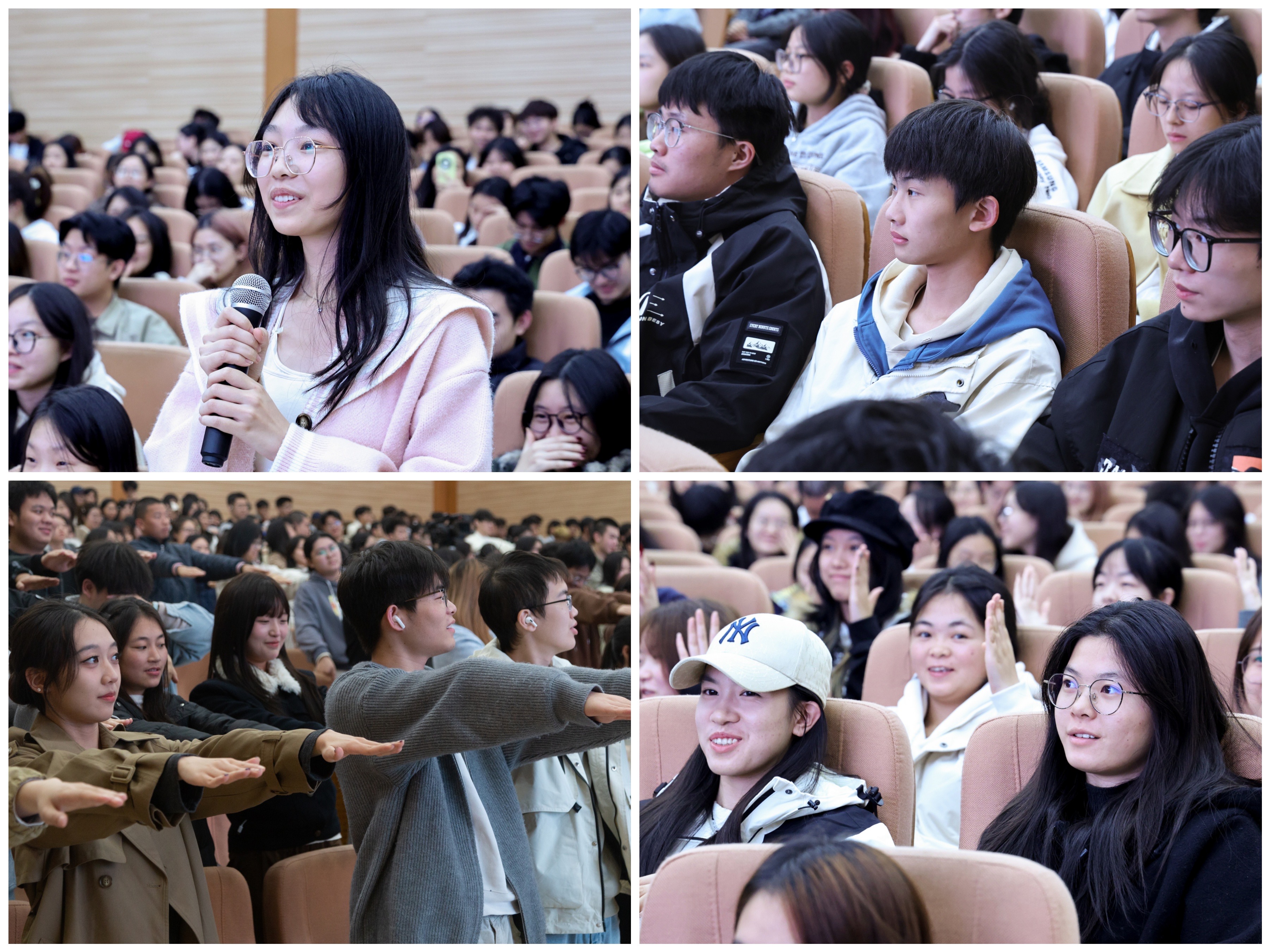 讲座尾声,杨凤池引用《心理访谈》题记“像科学家那样工作,像艺术家那样生活,运用有意识与无意识的精神力量,享受充满智慧的快乐人生”,勉励学子善用心理学智慧,活出精彩自我。现场还设置互动环节,通过“双手前举比坚持”的体验,生动诠释“快乐往往在与困难的对比中更为鲜明”的道理。
