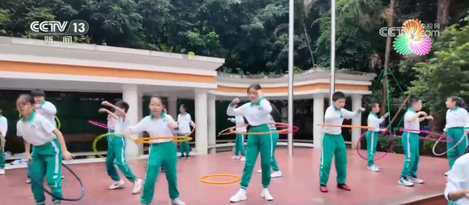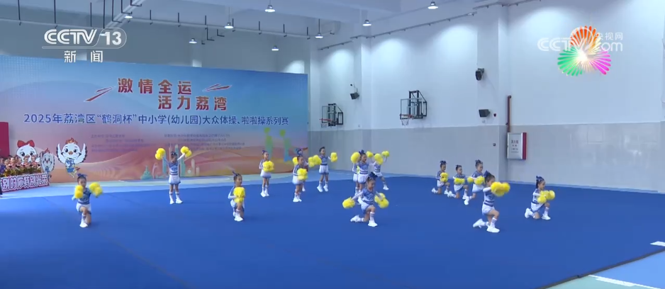 在广东广州荔湾区的鹤洞小学,正在举行“激情全运 活力荔湾”中小学、幼儿园大众体操和啦啦操比赛,吸引了全区40多所学校的1700多名学生踊跃参与。鹤洞小学校长吴路玉表示,学校将体操、柔韧操元素融入到每日的大课间活动中,尽量让每一个孩子,无论是否有体育特长,都能够接触体验,享受体操带来的身体协调性、柔韧性与节奏感的锻炼。