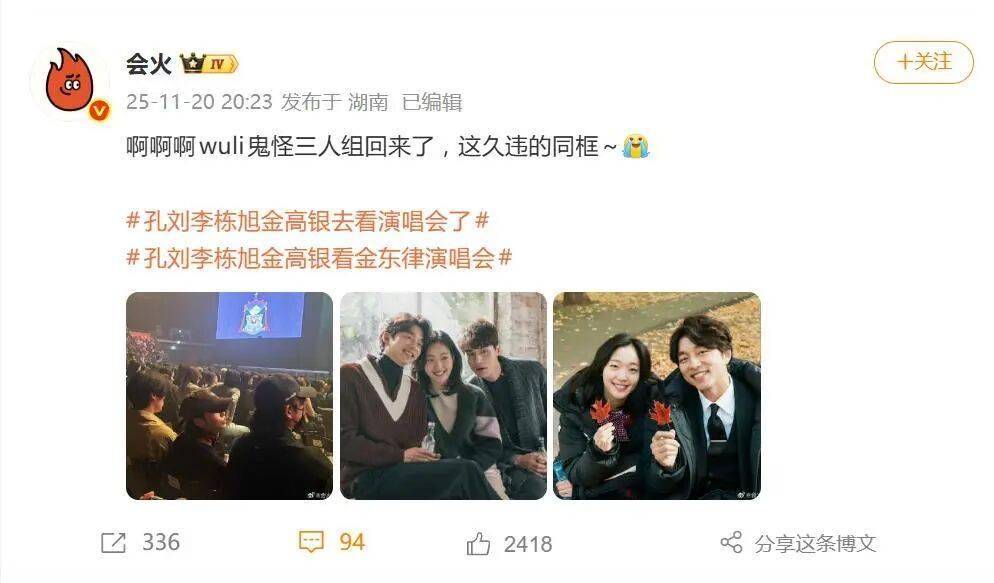 现场细节更是让“鬼怪”粉狂喜。三人座位紧密相邻,金高银坐在中间,孔刘与李栋旭分坐两侧。这个熟悉的布局,被眼尖的网友一眼看穿,完美复刻了剧中“鬼怪-新娘-阴间使者”的经典三角关系。此前关于他们“分开就座”的猜测被现场粉丝通过屏幕反光彻底击破,证明了这次同框是有意为之的“团建”。